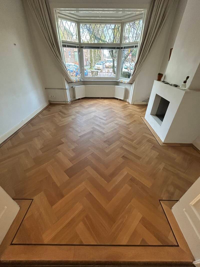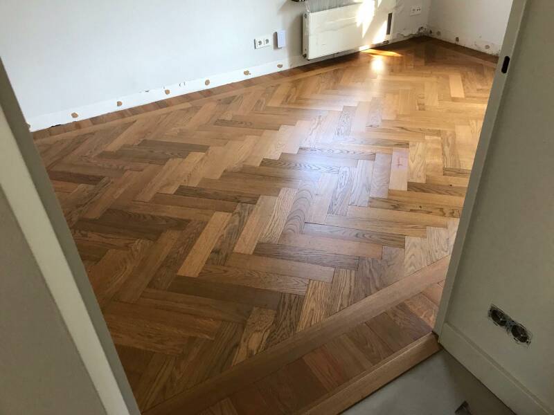 Eiken visgraat parket met band renovatie Dorst schuren en natuurlijke olie.