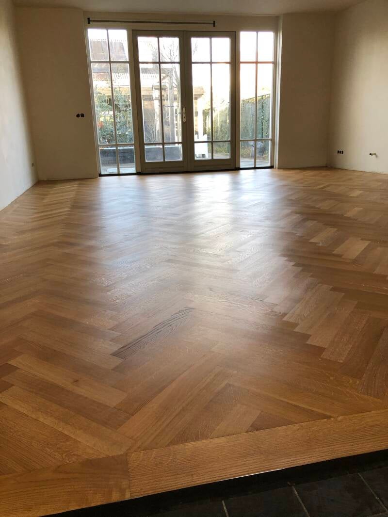 Onbewerkte visgraat vloer leggen Eindhoven. Stoppen, schuren en lak.