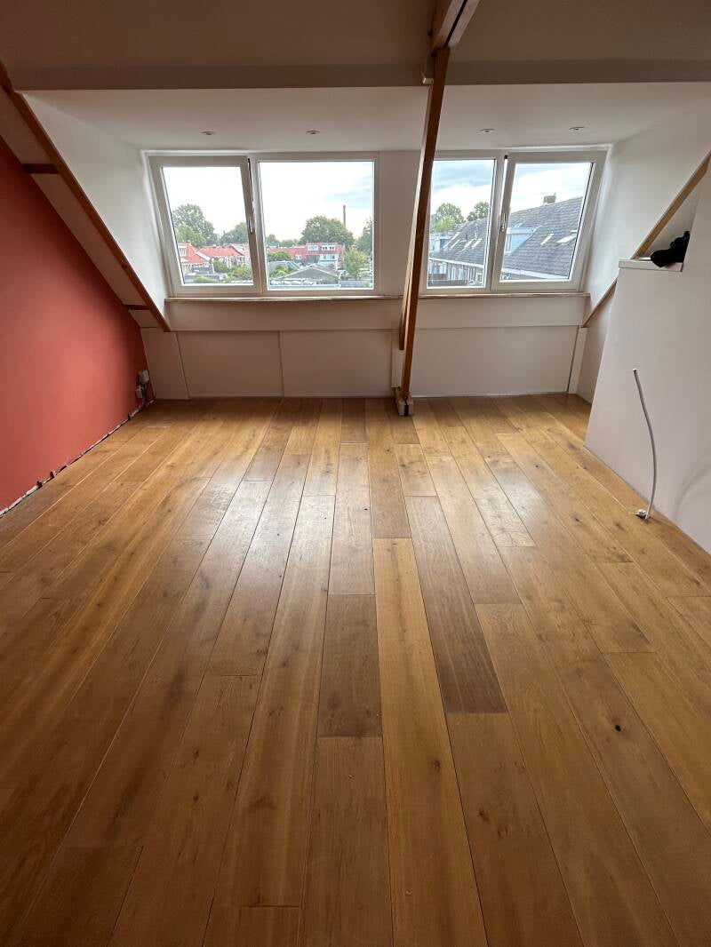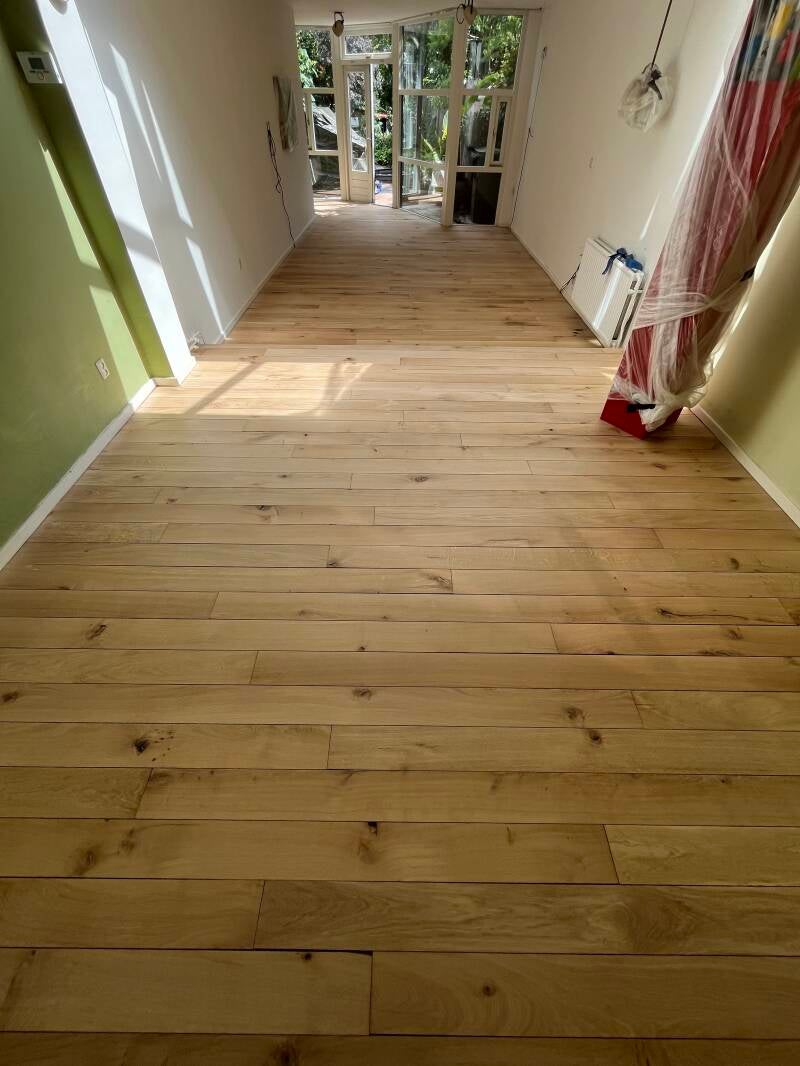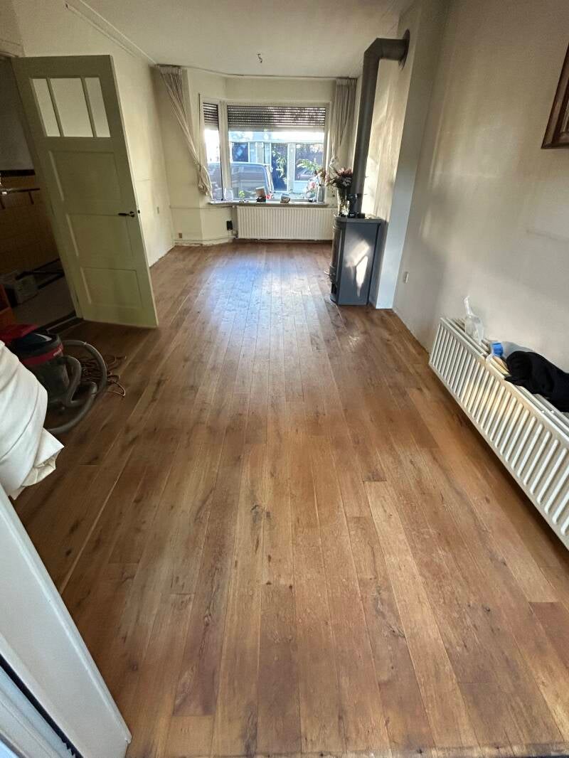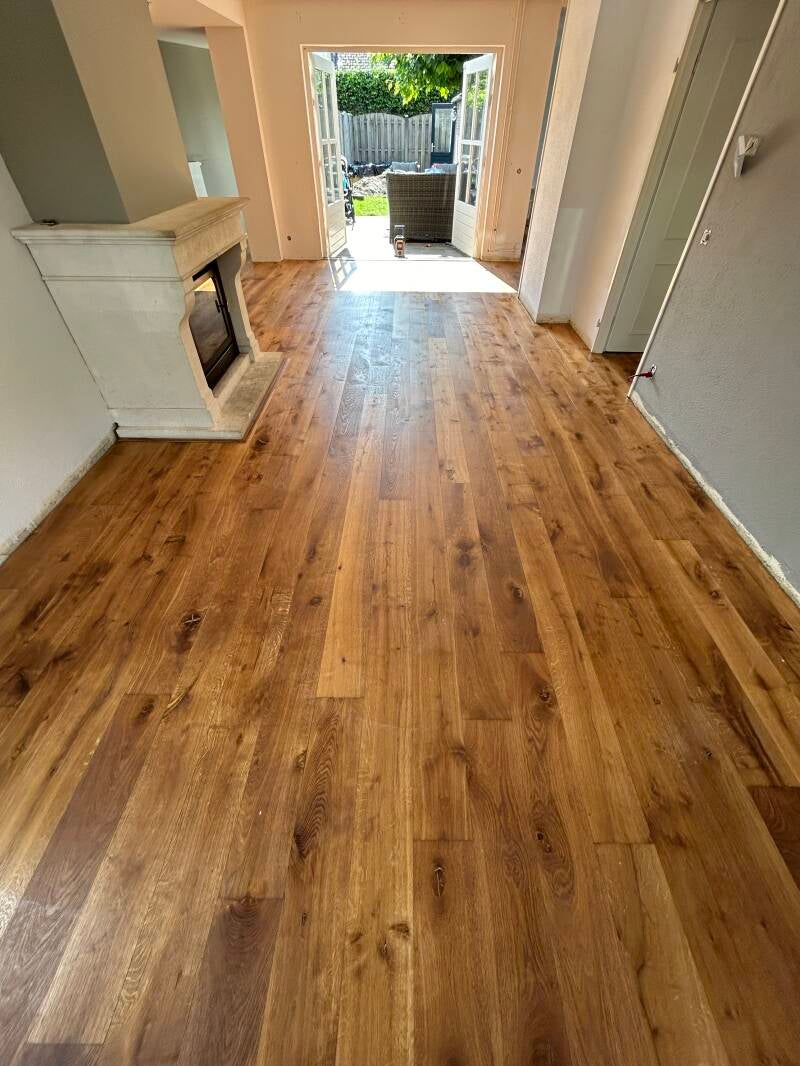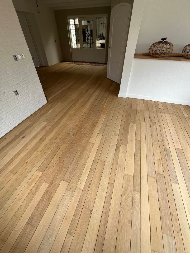 Eiken houten vloeren renovatie Udenhout schuren en naturel witte lak.