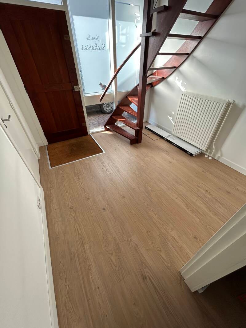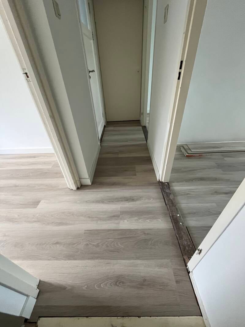 Egaliseren en visgraat pvc vloer leggen met plinten Waalwijk.