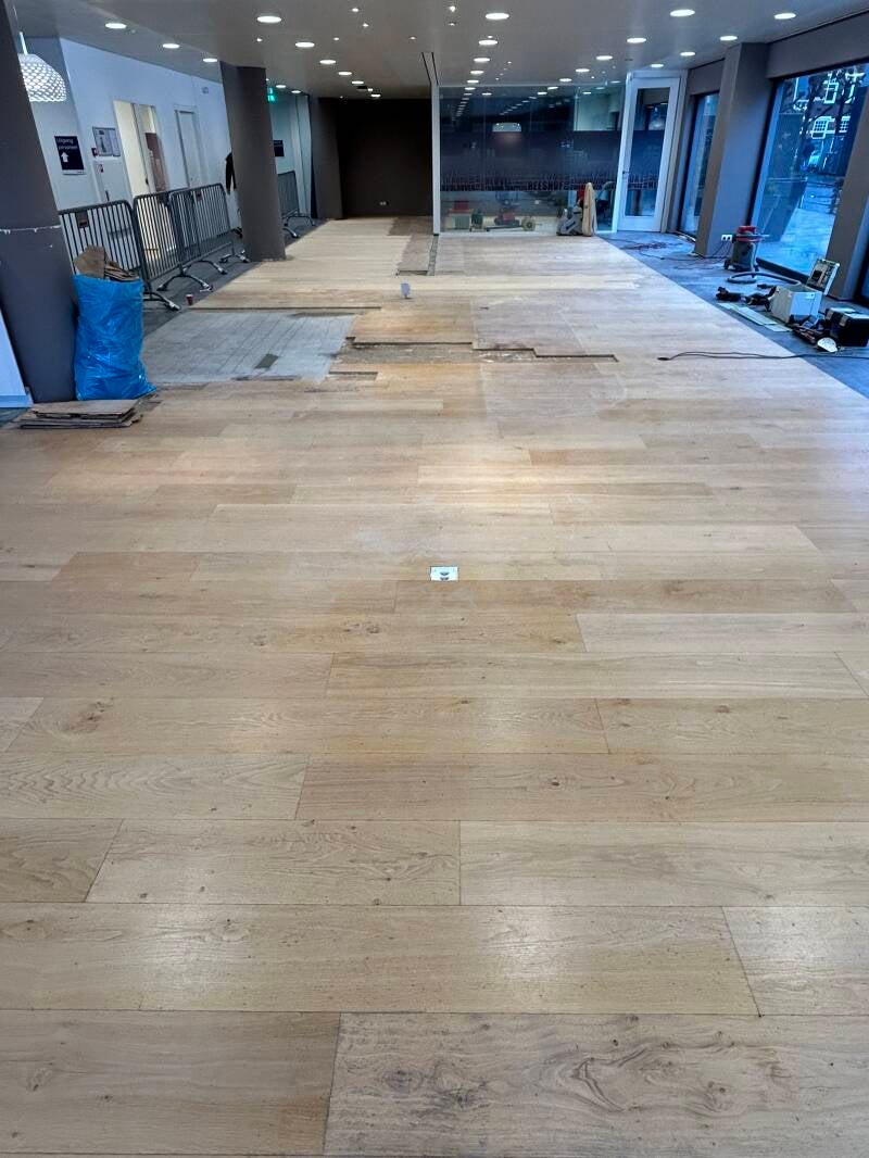 Eiken houten vloer renovatie met aanheling Rabobank Tilburg Schuren en lakken.
