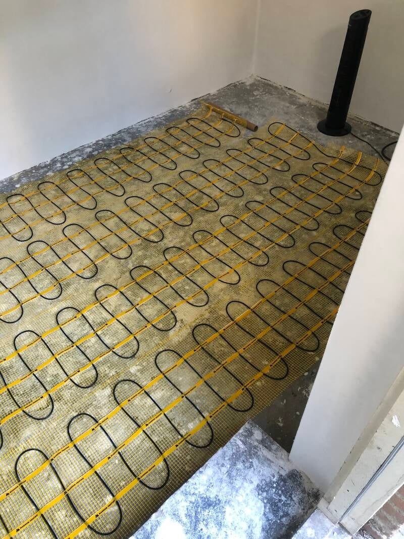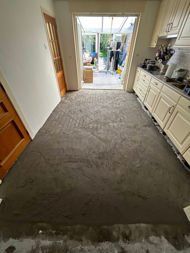 Vloerverwarming dicht smeren, egaliseren en visgraat plak PVC vloer leggen met plinten Roosendaal.