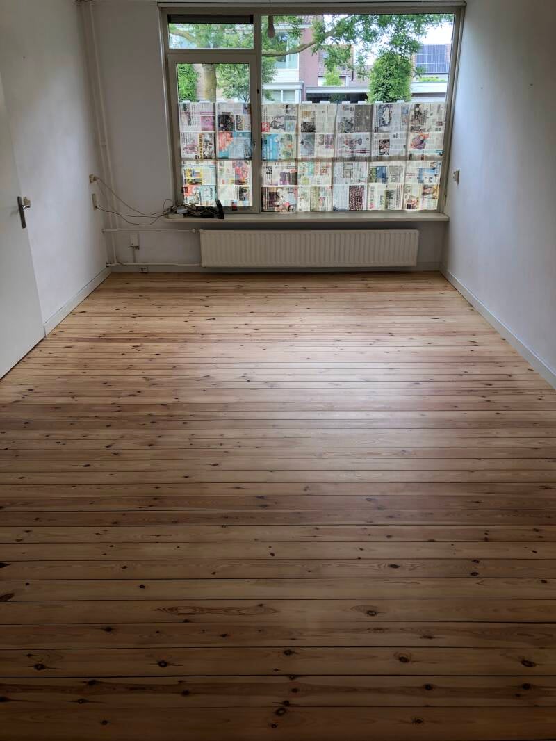 Grenen vloer renovatie Den Bosch schuren en 5% witte lak.