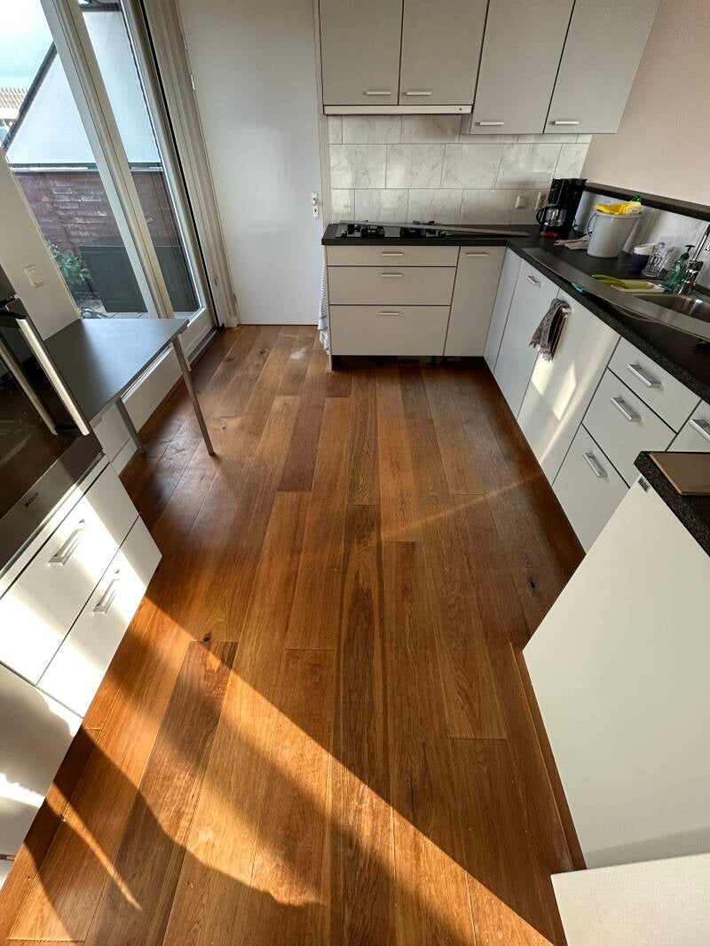 Eiken vloer renovatie en keuken aanheling Tilburg schuren en witte olie.